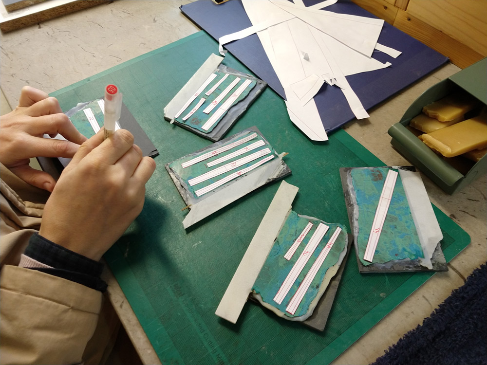 Lime Wood, 23k Gold Leaf, Chrysocolla Stone inlay, Garnet. 70x90cm