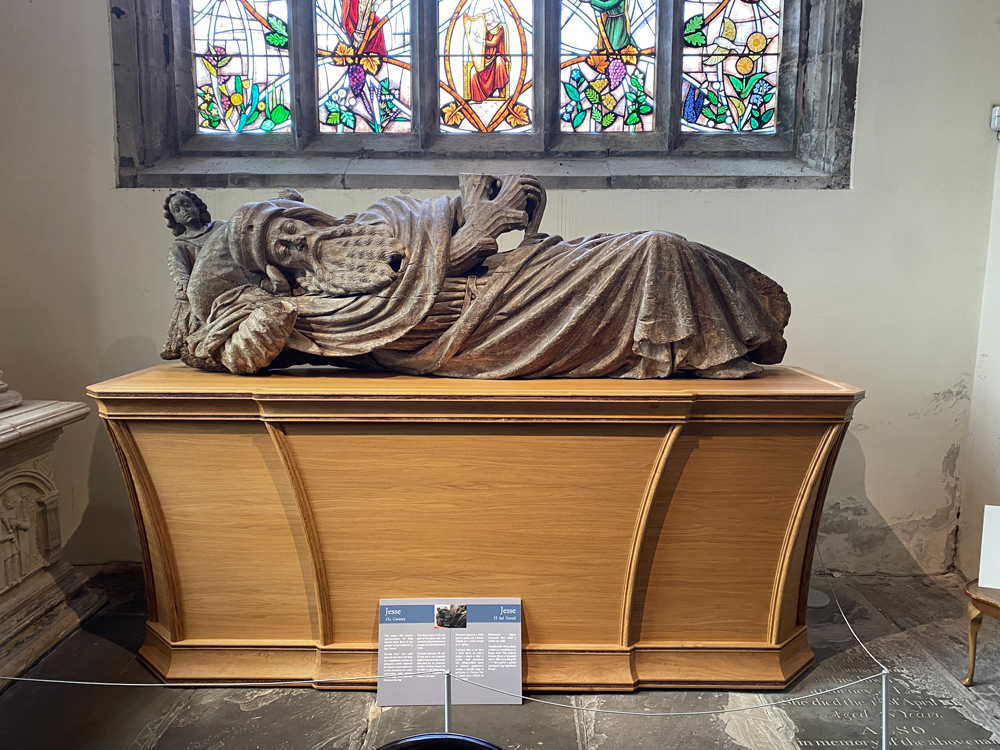 The impressive wooden sculpture once held a whole sculpted tree telling the lineage of Jesus. Nowadays only the lower part the reclined King Jesse remains. This tree has been beautifully recreated in the stained glass window by Stained Glass artist Helen Wittaker.