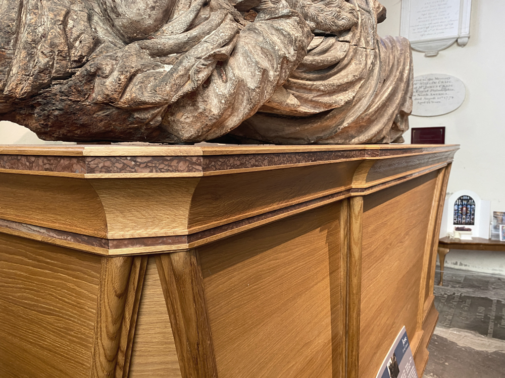 The design is inspired by the geometric proportioning system that can be found in the stained glass window right above the plinth – in that way, they form one unit. The inner framework of the plinth is made from pine to support the 400kg sculpture. The outer construction is made from oak with stripes of dark red marble inlay along the horizontal edges. The marble was chosen to correspond to the exquisite 15th century tombs which can be found in the church. All the stone inlay work was executed by Aline Marion.