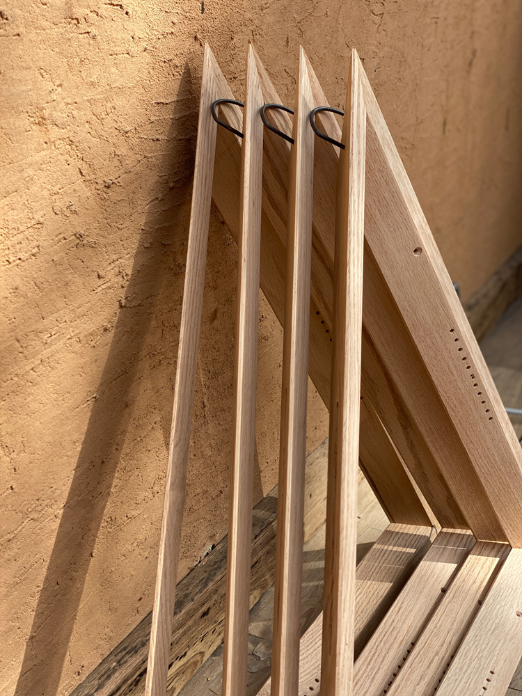 Oak, brass, cotton fabric and palm fronds