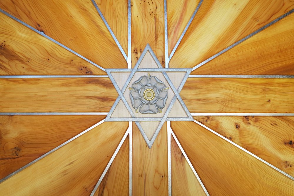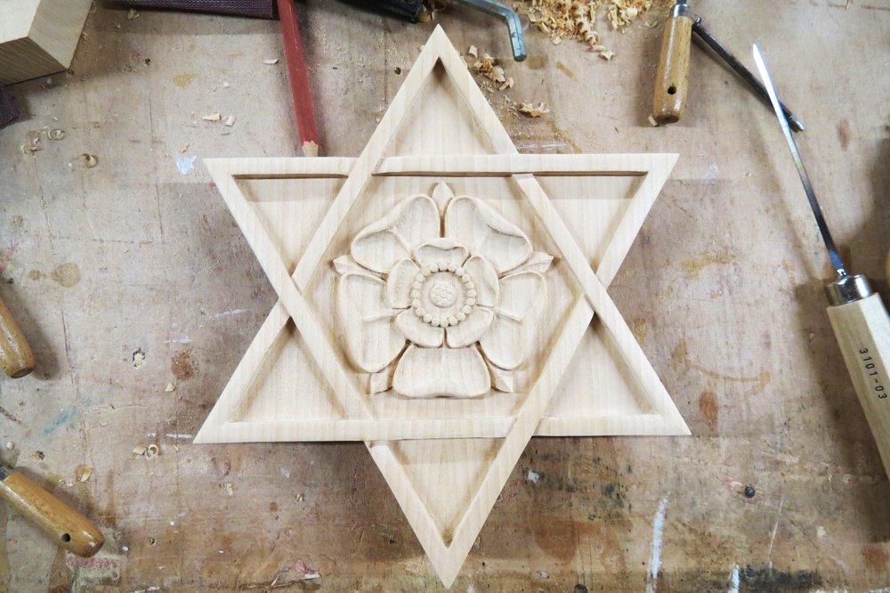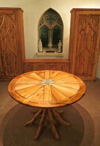 An altar table made from local yew for a Priory in Glastonbury, Sommerset. Around the edge are inscribed the names of twelve archangels, the central rose, carved by Aline Marion, is a variation of the Tudor rose.