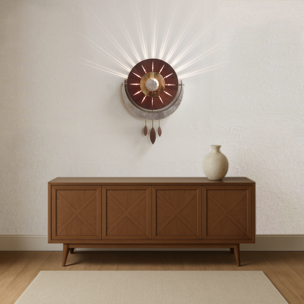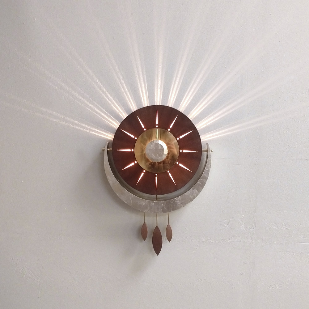 LUNA is a limited-edition sculptural wall lamp. Inspired by the ethereal beauty of the moon, and infused with some geometric extravagance, this captivating piece is handcrafted with meticulous attention to detail. LUNA features a striking arrangement of rays, creating a soothing ambiance. The interplay of light and shadow adds a magical touch to any space, transforming your walls into a canvas of artful illumination.